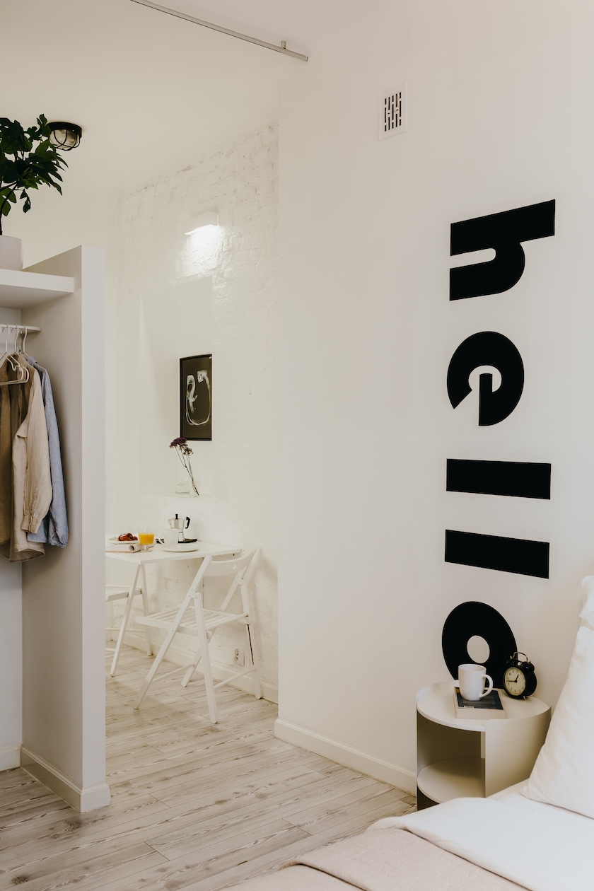 Apartament został zaprojektowany w stylu loftowym, a odsłonięte cegły na ścianach nadają mu autentyczną i przyjemną atmosferę.