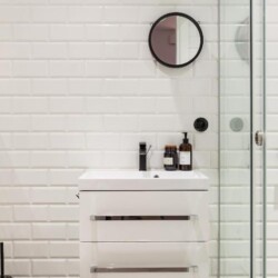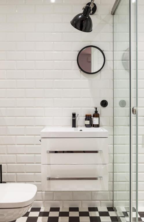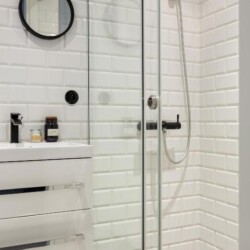 Łazienka apartamentu wyposażona jest w prysznic, umywalkę oraz WC.