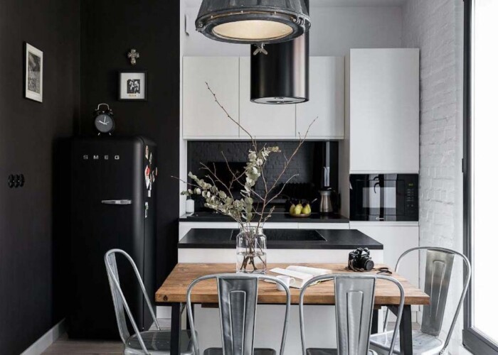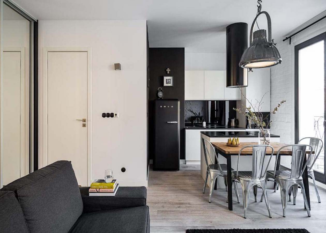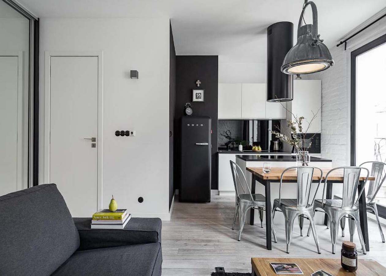 Kuchnia jest otwarta, co tworzy przyjemną atmosferę. Znajdziesz tu wszystkie niezbędne sprzęty do gotowania, takie jak kuchnia indukcyjna, lodówka z zamrażarką, zmywarka, mikrofalówka i pralka. Część jadalna, wyposażona w stół i krzesła, stwarza idealne miejsce do delektowania się posiłkami, pracy lub wieczornych rozrywek.