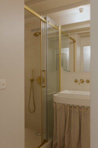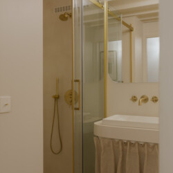 Łazienka jest wyposażona w prysznic, umywalkę i WC.