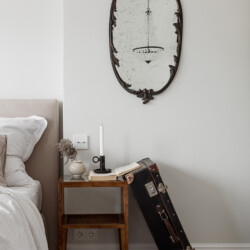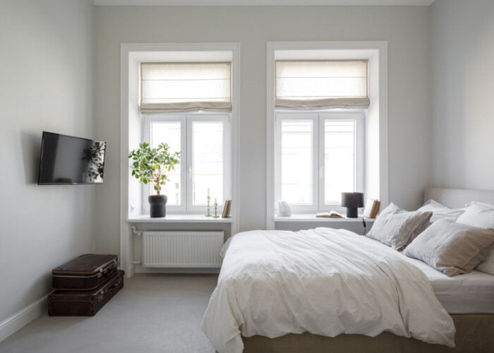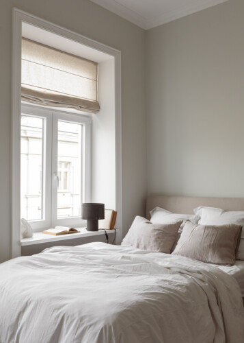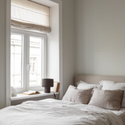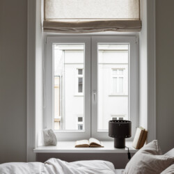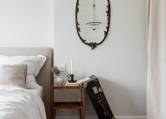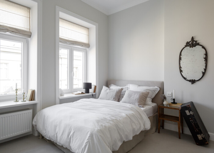 Mieszkanie wyposażone jest w wygodne podwójne łóżko o szerokości 140 cm, stolik nocny z nastrojową lampką oraz szafą wnękową.