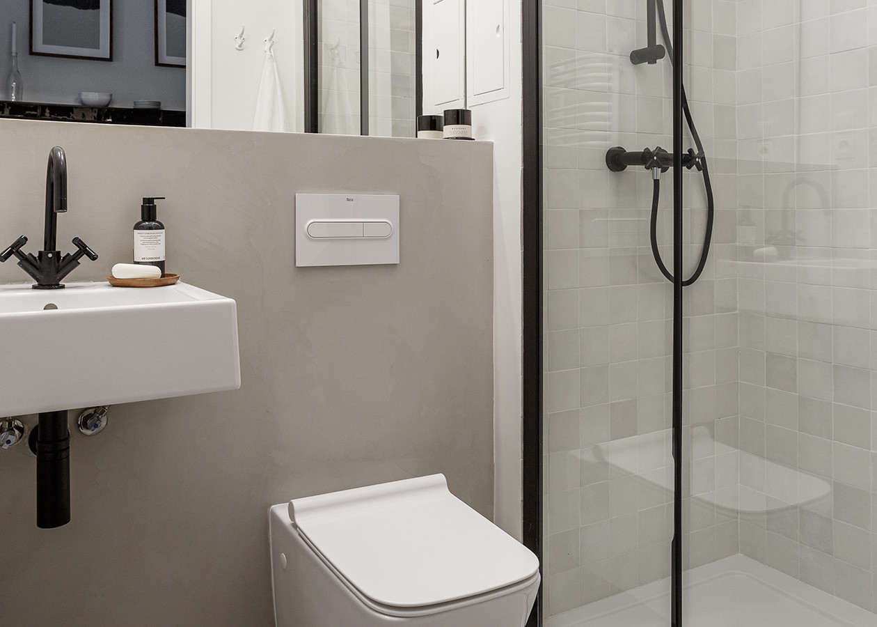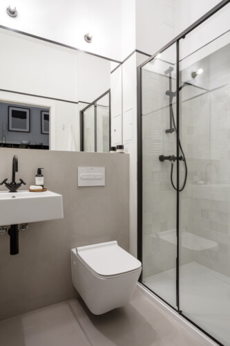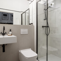 Łazienka jest wyposażona w prysznic, umywalkę i WC.