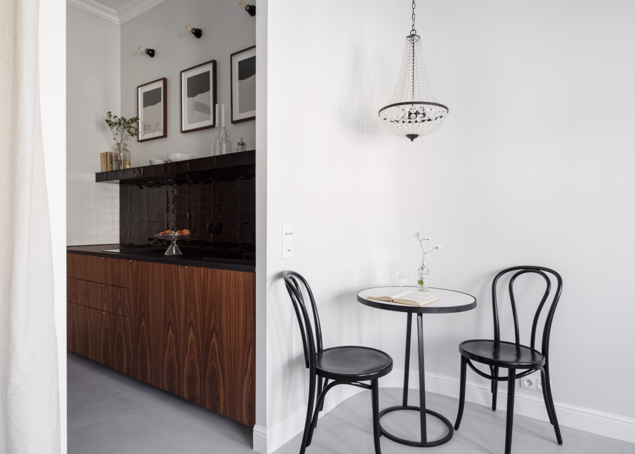 W pełni wyposażony aneks kuchenny oferuje wszystkie niezbędne przybory kuchenne, lodówkę z zamrażalnikiem, płytę indukcyjną, czajnik elektryczny oraz zestaw do parzenia kawy i herbaty. Stół z krzesłami zapewnia wygodne miejsce do spożywania posiłków czy pracy.