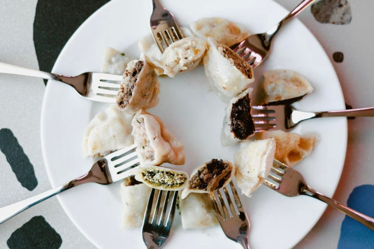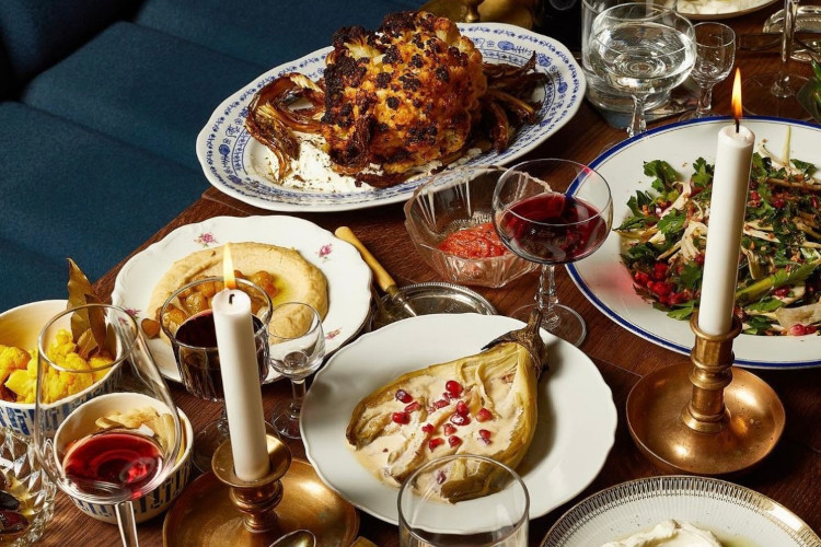 Restauracja o ciekawym wystroju w stylu retro. z kuchnią izraelską, która opiera się na koncepcie podawania dań na talerzykach do wspólnego dzielenia.